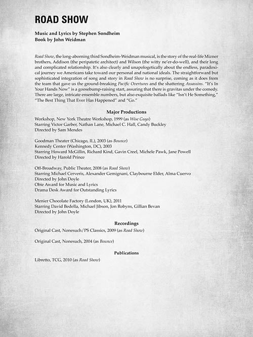 Vocal selections from the long-aborning third Sondheim-Weidman musical, about the story of the real-life Mizner brothers and their long and complicated relationship. 7 songs, including: The Best Thing That Ever Has Happened · Brotherly Love · The Game · Get Out/Go · Isn't He Something! · It's in Your Hands Now · Talent.