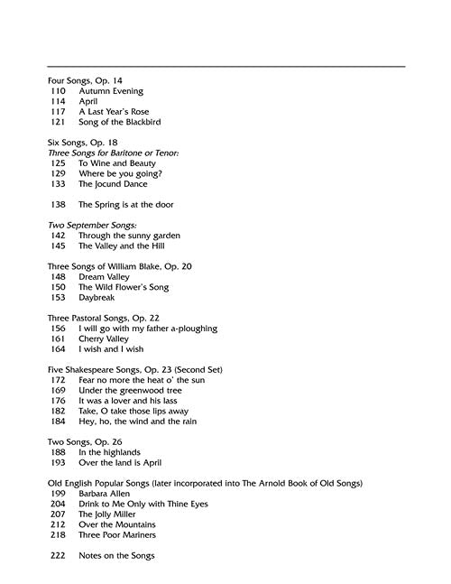 With a graceful gift for lyrical vocal writing, English composer Roger Quilter (1877-1953) created a rich body of art songs. Very few composers working in English have matched his achievement of a living body of beloved, relevant, literate repertoire. Contents: April · Autumn Evening · Barbara Allen · Blow, blow, thou winter wind · The Bracelet · Brown is my love · By a Fountainside · By the Sea · Cherry Ripe · Cherry Valley · Come away, death · Come Back! Damask Roses · Daybreak · Dream Valley · Drink to me Only with Thine Eyes · Fair House of Joy · The Faithless Shepherdess · Fear no more the heat o' the sun · A Good Child · Hey, ho, the wind and the rain · I will go with my father a-ploughing · I wish and I wish · In the highlands · Interlude · It was a lover and his lass · The jocund Dance · The jolly miller · Julia's Hair · June The Lamplighter · A Last Year's Rose · Love's Philosophy · The Maiden Blush · Moonlight · My Life's Delight · The Night Piece · Now sleeps the crimson petal · O mistress mine · Over the land is April · Over the Mountains · Prelude · The Sea-Bird · A Secret · Song of the Blackbird · Spring is at the door · Take, take those lips away · Three poor Mariners · Through the sunny garden · To Daisies · To Wine and Beauty · Under the greenwood tree · The Valley and the Hill · Weep you no more · Where be you going? · Where Go the Boats? · The Wild Flower's Song