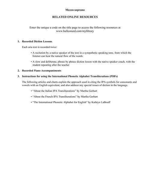 Many students only need a few opera arias in their vocal study. Selected Opera Arias extracts 10 arias useful to the typical voice student from the G. Schirmer Opera Anthology, with plot notes, translations and IPA, and combines them with the diction lessons recorded by top coaches in New York, and accompaniments recorded by coaches on staff at Lyric Opera of Chicago. The voice student gets a value priced, complete package for the very best instruction. IL BARBIERE DI SIVIGLIA: Una voce poco fa · CARMEN: L'amour est un oiseau rebelle (Habanera) · Près des remparts de Séville (Seguidilla) · COSÌ FAN TUTTE: Smanie implaccabili · DIDO AND AENEAS: When I am laid in earth · FAUST: Faites-lui mes aveux · LE NOZZE DI FIGARO: Non so più cosa son · Voi, che sapete · ORFEO ED EURIDICE: Che farò senza Euridice? · VANESSA: Must the winter come so soon.