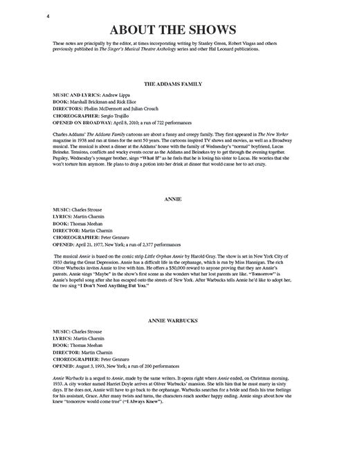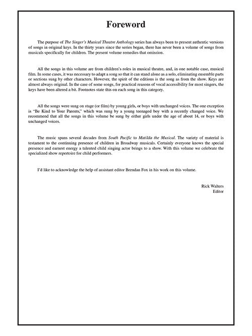 This volume of the Singer's Musical Theatre Anthology series is specially designed for child theatre singers, with songs originally sung by children, in authentic editions. The collection features a mix of classic and contemporary songs and includes plot notes on each show. The professionally recorded piano accompaniments are accessed online using the unique code inside each book and can be streamed or downloaded. The audio files include PLAYBACK+, a multi-functional audio player that allows you to slow down audio without changing pitch, set loop points, change keys, and pan left or right. Contents: THE ADDAMS FAMILY: What If · ANNIE: Maybe · I Don't Need Anything But You · You're Never Fully Dressed Without a Smile · ANNIE WARBUCKS: I Always Knew · BILLY ELLIOT: Electricity · Expressing Yourself · THE BOY FROM OZ: When I Get My Name in Lights · A CHRISTMAS STORY - THE MUSICAL: Counting Down to Christmas · Red Ryder® Carbine Action BB Gun · Somewhere Hovering Over Indiana · FANNY: Be Kind to Your Parents · FROZEN (film): Do You Want to Build a Snowman? · GYPSY: Let Me Entertain You · INTO THE WOODS: I Know Things Now · Into the Woods · THE KING AND I: Getting to Know You · I Whistle a Happy Tune · MAME: My Best Girl · MATILDA THE MUSICAL: Naughty · Quiet · When I Grow Up · LES MISÉRABLES: Castle on a Cloud · Little People · THE MUSIC MAN: Gary, Indiana · NINE: Getting Tall · OLIVER!: Where Is Love? · Who Will Buy? · RUTHLESS: Born to Entertain · THE SECRET GARDEN: The Girl I Mean to Be · Round-Shouldered Man · SEUSSICAL THE MUSICAL: Green Eggs and Ham · It's Possible (In McElligot's Pool) · SHREK THE MUSICAL: I Know It's Today · SOUTH PACIFIC: Dites-Moi (Tell Me Why) · TARZAN: I Need to Know