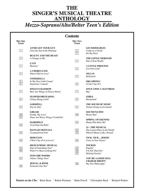 Contents: ANNIE GET YOUR GUN: I Got the Sun in the Morning · BEAUTY AND THE BEAST: A Change in Me · CATS: Memory · A CHORUS LINE: What I Did for Love · CINDERELLA: In My Own Little Corner, Stepsisters' Lament · FINIAN'S RAINBOW: How Are Things in Glocca Morra · FLOWER DRUM SONG: I Enjoy Being a Girl · GODSPELL: Day by Day · GREASE: Freddy, My Love, There Are Worse Things I Could Do · HAIRSPRAY: I Can Hear the Bells · HANNAH MONTANA: I Learned from You · HERCULES: I Won't Say (I'm in Love) · HIGH SCHOOL MUSICAL: Start of Something New, What I've Been Looking For · INTO THE WOODS: I Know Things Now · JEKYLL & HYDE: Someone Like You · LES MISÉRABLES: Castle on a Cloud, On My Own · THE LITTLE MERMAID: Part of Your World · A LITTLE PRINCESS: Live Out Loud · MULAN: Reflection · OKLAHOMA!: I Cain't Say No · ONCE UPON A MATTRESS: Shy · SMILE: Disneyland · THE SOUND OF MUSIC: Sixteen Going on Seventeen · SOUTH PACIFIC: Honey Bun · SPRING AWAKENING: Mama Who Bore Me · 13-THE MUSICAL: The Lamest Place in the World, What It Means to Be a Friend · TICK, TICK... BOOM!: Come to Your Senses · WICKED: Popular, I'm Not That Girl, Defying Gravity · YOU'RE A GOOD MAN, CHARLIE BROWN: My New Philosophy