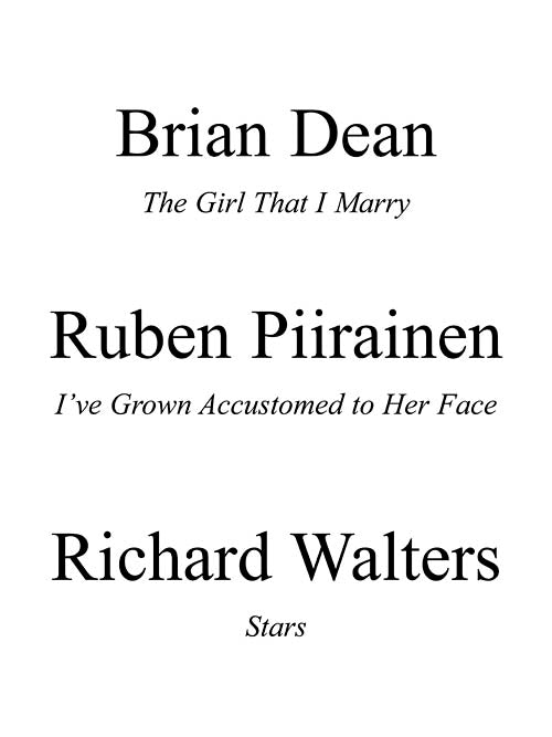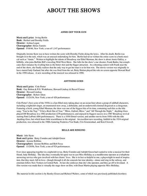 Contents: ANNIE GET YOUR GUN: The Girl That I Marry, My Defenses Are Down · ANYTHING GOES: All Through the Night · BELLS ARE RINGING: Long Before I Knew You, Just in Time · THE BOYS FROM SYRACUSE: This Can't Be Love · CAN-CAN: It's All Right With Me · CAROUSEL: The Highest Judge Of All · DO RE MI: All of My Life · GENTLEMEN PREFER BLONDES: Bye Bye Baby · GUYS AND DOLLS: My Time of Day, Luck Be a Lady, More I Cannot Wish You · JESUS CHRIST SUPERSTAR: Pilate's Dream · KISMET: Fate · KISS ME, KATE: I've Come to Wive it Wealthily in Padua · KNICKERBOCKER HOLIDAY: There@#$%s Nowhere to Go But Up · LITTLE MARY SUNSHINE: You're the Fairest Flower · A LITTLE NIGHT MUSIC: In Praise of Women · MACK AND MABEL: I Won't Send Roses · ME AND MY GIRL: Leaning on a Lamp-Post · MERRILY WE ROLL ALONG: Good Thing Going · LES MISERABLES: Empty Chairs at Empty Tables, Stars · MILLE. MOSISTE: I Want What I Want When I Want It · THE MOST HAPPY FELLA: Joey, Joey, Joey · MY FAIR LADY: I've Grown Accustomed to Her Face · NINE: Guido's Song, Only With You · OKLAHOMA!: The Surrey with the Fringe on Top · OLIVER!: My Name · ON THE TOWN: Lonely Town · PIPE DREAM: All At Once You Love Her, The Man I Used to Be · PROMISES, PROMISES: Promises, Promises · SHE LOVES ME: Ilona · SILK STOCKINGS: All of You · STREET SCENE: Wouldn't You Like to Be on Broadway · THE UNSINKABLE MOLLY BROWN: I'll Never Say No · WHERE'S CHARLEY: Once in Love with Amy