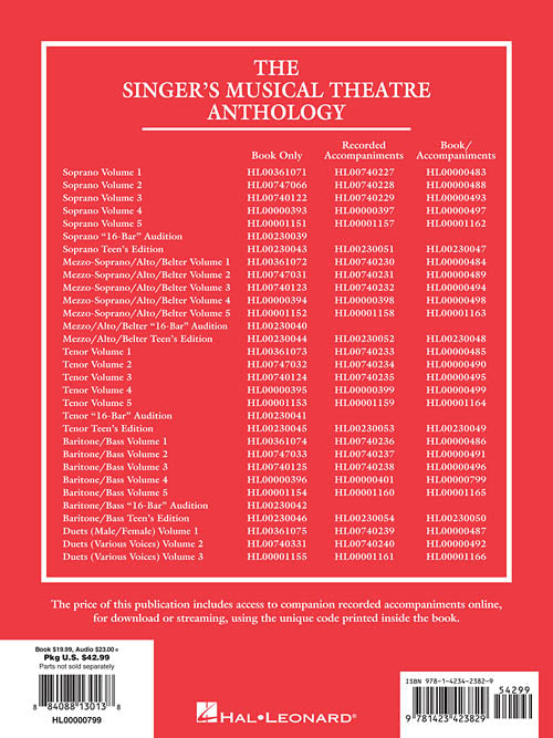 The world's most trusted source for great theatre literature for singing actors. The audio tracks available online include piano accompaniments. The book features authentic editions of each song in the original keys. The songs have been carefully chosen for each voice type and are culled from a wide selection of classic and contemporary shows. Contents: ALLEGRO: A Fellow Needs a Girl · ANNIE GET YOUR GUN: I'm a Bad, Bad Man · ASPECTS OF LOVE: Other Pleasures · AVENUE Q: What Do You Do with a B.A. in English, I'm Not Wearing Underwear Today, Fantasies Come True · BIG RIVER: Waitin' for the Light to Shine · BYE BYE BIRDIE: Put on a Happy Face, A Lot of Livin' to Do · LA CAGE AUX FOLLES: Masculinity · CAMELOT: I Wonder What the King Is Doing Tonight · ELEGIES FOR ANGELS, PUNKS, AND RAGING QUEENS: Heroes All Around · FOLLIES: The Right Girl · A FUNNY THING HAPPENED ON THE WAY TO THE FORUM: Bring Me My Bride · GREASE: Greased Lightnin' · I LOVE YOU, YOU'RE PERFECT, NOW CHANGE: Shouldn't I Be Less in Love with You? · JOSEPH AND THE AMAZING TECHNICOLOR® DREAMCOAT: Those Canaan Days · LOUISIANA PURCHASE: What Chance Have I with Love? · MILK AND HONEY: There's No Reason in the world · MONTY PYTHON'S SPAMALOT: Always Look on the Bright Side of Life · THE MUSIC MAN: Ya Got Trouble · MY FAIR LADY: With a Little Bit of Luck, Get Me to the Church on Time · PAINT YOUR WAGON: Wand'rin' Star · THE PRODUCERS: In Old Bavaria, Along Came Baily, Haben Sie Gehort Das Deutsche Band? (Have You Ever Heard the German Band?) · RAGTIME: Make Them Hear You · THE RINK: Marry Me · THE ROAR OF THE GREASEPAINT-THE SMELL OF THE CROWD: A Wonderful Day Like Today, Who Can I Turn To? (When Nobody Needs Me) · 1776: Molasses to Rum · THE SOUND OF MUSIC: Edelweiss · WICKED: Wonderul · THE WILD PARTY: I'll Be Here · WISH YOU WERE HERE: Relax · WOMAN OF THE YEAR: Sometimes a Day Goes By · WONDERFUL TOWN: A Quiet Girl, It's Love · YOU'RE A GOOD MAN CHARLIE BROWN: The Kite (Charlie Brown's Kite)