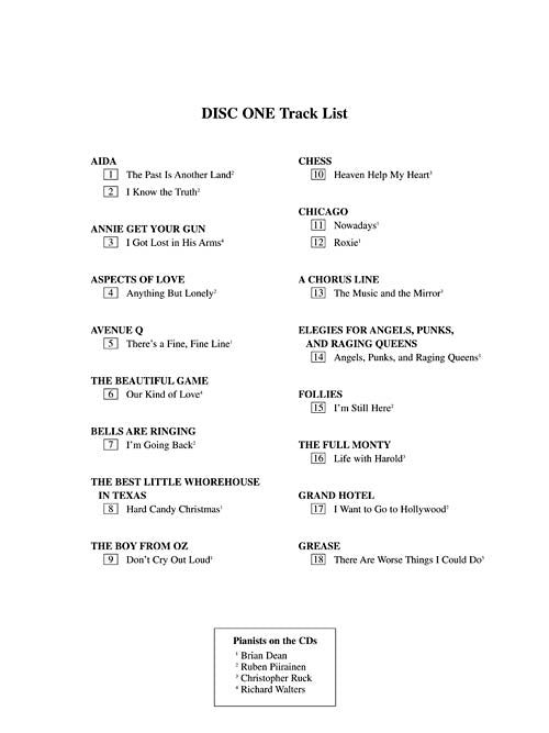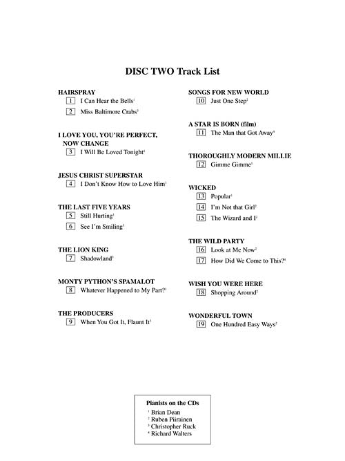 Contents: AIDA: The Past Is Another Land, I Know the Truth · ANNIE GET YOUR GUN: I Got Lost in His Arms · ASPECTS OF LOVE: Anything But Lonely · AVENUE Q: There's a Fine, Fine Line · THE BEAUTIFUL GAME: Our Kind of Love · BELLS ARE RINGING: I' m Going Back · THE BEST LITTLE WHOREHOUSE IN TEXAS: Hard Candy Christmas · THE BOY FROM OZ: Don't Cry Out Loud · CHESS: Heaven Help My Heart · CHICAGO: Nowadays, Roxie · A CHORUS LINE: The Music and the Mirror · ELEGIES FOR ANGELS, PUNKS, AND RAGING QUEENS: Angels, Punks, and Raging Queens · FOLLIES: I' m Still Here · THE FULL MONTY: Life with Harold · GRAND HOTEL: I Want to Go to Hollywood · GREASE: There Are Worse Things I Could Do · HAIRSPRAY: I Can Hear the Bells, Miss Baltimore Crabs · I LOVE YOU, YOU'RE PERFECT, NOW CHANGE: I Will Be Loved Tonight · JESUS CHRIST SUPERSTAR: I Don't Know How to Love Him · THE LAST FIVE YEARS: Still Hurting, See I' m Smiling · THE LION KING: Shadowland · MONTY PYTHON'S SPAMALOT: Whatever Happened to My Part? · THE PRODUCERS: When You Got It, Flaunt It · SONGS FOR NEW WORLD: Just One Step · A STAR IS BORN (film): The Man that Got Away · THOROUGHLY MODERN MILLIE: Gimme Gimme · WICKED: Popular, I' m Not that Girl, The Wizard and I · THE WILD PARTY: Look at Me Now, How Did We Come to This? · WISH YOU WERE HERE: Shopping Around · WONDERFUL TOWN: One Hundred Easy Ways