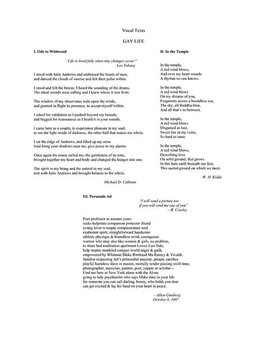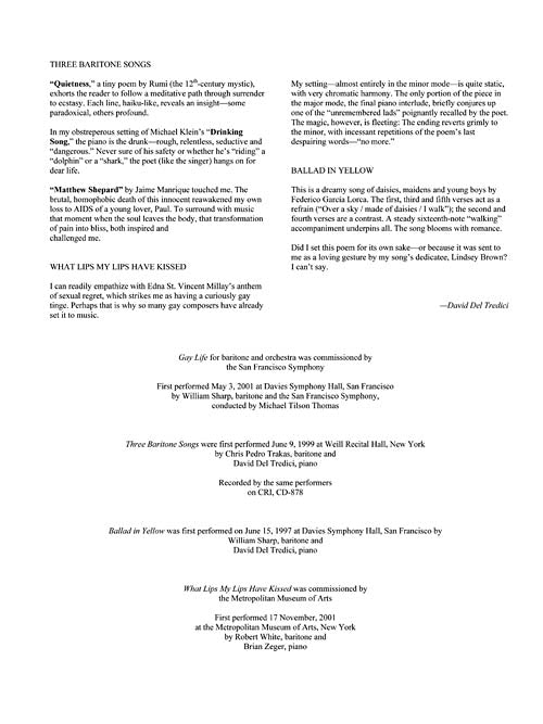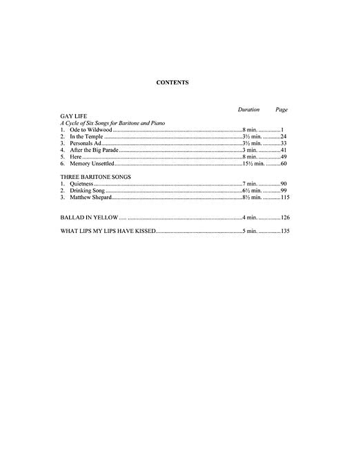 Includes the Gay Life, a cycle of 6 songs with words by various writers, including Allen Ginsberg and Paul Monette, three baritone songs, and two single songs: What Lips My Lips Have Kissed (poem by Edna St. Vincent Millay), and Ballad in Yellow (poem by Federico García Lorca).