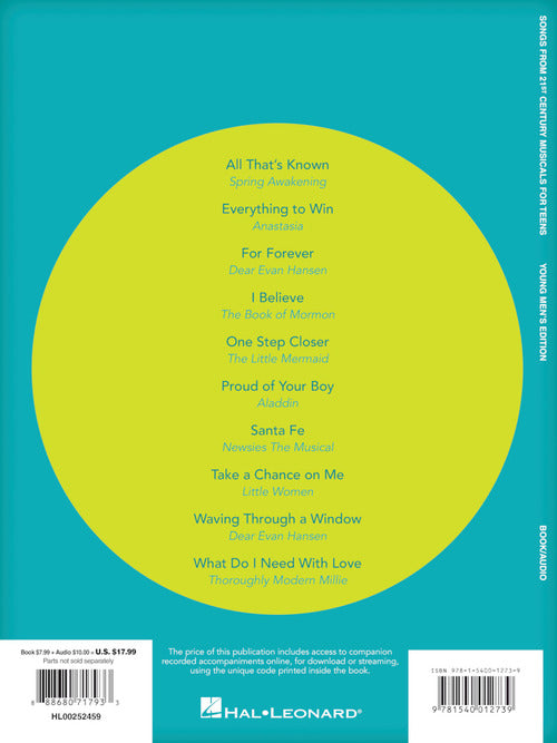 10 songs from 9 musicals since the turn of the century, many of which have limited availability in a collection. Includes: All That's Known from Spring Awakening · Everything to Win from Anastasia · For Forever from Dear Evan Hansen · I Believe from The Book of Mormon · One Step Closer from The Little Mermaid · Proud of Your Boy from Aladdin · Santa Fe from Newsies the Musical · Take a Chance on Me from Little Women · Waving Through a Window from Dear Evan Hansen · What Do I Need with Love from Thoroughly Modern Millie.