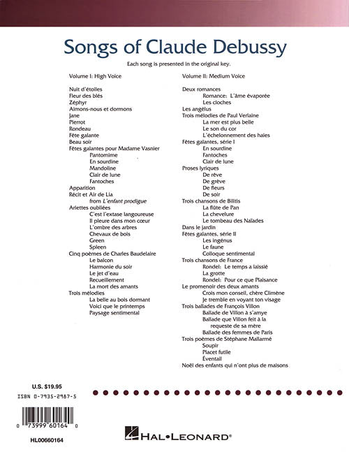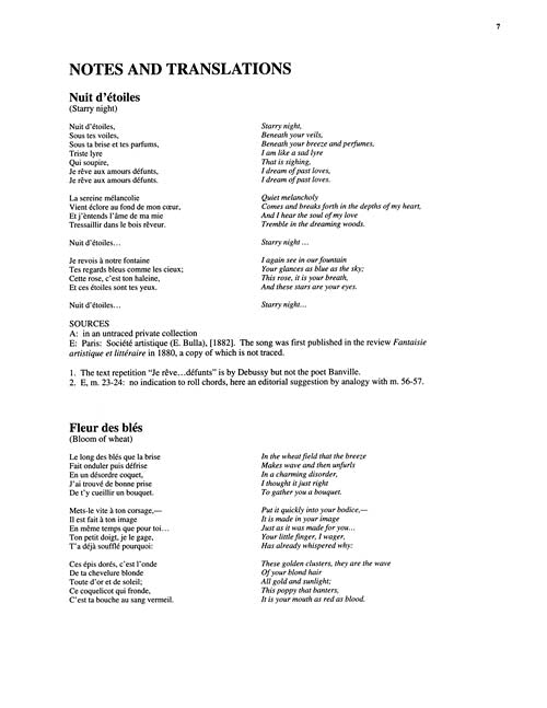 A major new critical edition of important standard repertory with 61 songs in 2 volumes. All songs are presented only in the original key, with no transpositions. All the song cycles and groupings appear in one of the two volumes. Years in preparation, this edition is based on the most reliable sources available in the world, with most of the research centered at the Bibliotheque Nationale in Paris. Each song is presented with a line-by-line translation and full critical notes citing the research as it applies to specifics in the songs. Also includes a glossary of French terms. Contents: Nuit d'étoiles · Fleur des blés · Zéphyr · Aimons-nous et dormons · Jane · Pierrot · Rondeau · FÉte galante · Beau soir · FÉtes galantes pour Madame Vasnier (Pantomime; En sourdine; Mandoline; Clair de lune; Fantoches) · Apparition · Récti et Air de Lia · Ariettes oubliées (C'est l'extase langoureuse; Il pleure dans mon coeur; L'ombre des arbres; Chevaus de bois; Green; Spleen) · Cinq poèmes de Charles Baudelaire (Le balcon; Harmonie du soir; Le jet d'eau; Recueillement; La mort des amants) · Trois mélodies (La beele au bois dormant; Voici que le printemps; Paysage sentimental).
