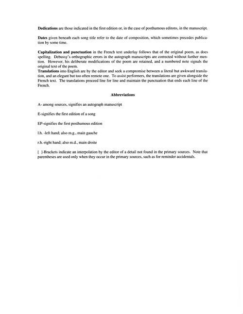 A major new critical edition of important standard repertory with 61 songs in 2 volumes. All songs are presented only in the original key, with no transpositions. All the song cycles and groupings appear in one of the two volumes. Years in preparation, this edition is based on the most reliable sources available in the world, with most of the research centered at the Bibliotheque Nationale in Paris. Each song is presented with a line-by-line translation and full critical notes citing the research as it applies to specifics in the songs. Also includes a glossary of French terms. Contents: Deux romances (Romance: L'ëme évaporée; Les cloches) · Les angélus · Trois mélodies de Paul Verlaine (La mer est plus belle; Le son du cor; L'échelonnement des haies) · FÉtes galantes, série I (En sourdine; Fantoches; Clair de lune) · Proses lyriques (De rÉve; De grève; De fleurs; De soir) · Trois chansons de Bilitis (La flte de Pan; La chevelure; Le tombeau des Naïades) · Dans le jardin · FÉtes galantes, série II (Les ingénus; Le faune; Colloque sentimental) · Trois chansons de France (Rondel: Le temps a laissié; La grotte; Rondel: Pour ce que Palisance) · Le promenoir des deux amants (Crois mon conseil, chère Climène; Je tremble en voyant ton visage) · Trois ballads de François Villon (Ballade de Villon à s'amye; Ballade que Villon feit à la requeste de sa mère; Ballade des femmes de Paris) · Trois poèmes de Stéphane Mallarmé (Soupir, Placet futile, Evantali) · Noël des enfant qui n'ont plus de maisons.