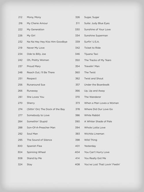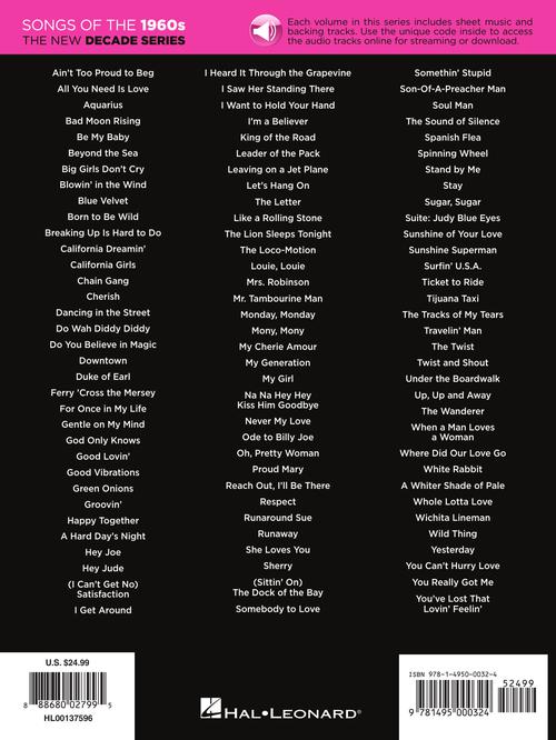 101 songs that defined the 1960s with all its revolutions in music and pop culture. The book includes optional orchestrated backing tracks for each song so you can sound like a pro. You access the tracks online for streaming or download. Songs include: All You Need Is Love · Aquarius · Bad Moon Rising · Beyond the Sea · Blowin' in the Wind · Blue Velvet · Born to Be Wild · California Dreamin' · California Girls · Dancing in the Street · Downtown · For Once in My Life · Green Onions · Happy Together · Hey Joe · Hey Jude · (I Can't Get No) Satisfaction · I Heard It Through the Grapevine · I'm a Believer · King of the Road · Leader of the Pack · Leaving on a Jet Plane · Louie, Louie · Mrs. Robinson · Monday, Monday · Mony, Mony · My Generation · Oh, Pretty Woman · Proud Mary · Respect · (Sittin' On) The Dock of the Bay · Soul Man · Stand by Me · Sunshine of Your Love · Ticket to Ride · The Tracks of My Tears · Under the Boardwalk · Wild Thing · Yesterday · You Really Got Me · and more.