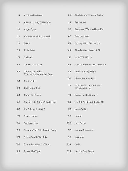 This songbook doubles as a time capsule, preserving over 80 of the '80s best arranged for P/V/G with great orchestrated backing tracks so you can play and sound like a pro. You access the tracks online for streaming or download. Songs include: Addicted to Love · Another Brick in the Wall · Beat It · Billie Jean · Call Me · Careless Whisper · Chariots of Fire · Come on Eileen · Don't Stop Believin' · Endless Love · Every Breath You Take · Every Rose Has Its Thorn · Eye of the Tiger · Flashdance...What a Feeling · Footloose · Girls Just Want to Have Fun · I Just Called to Say I Love You · I Love Rock 'N Roll · Islands in the Stream · It's Still Rock and Roll to Me · Jessie's Girl · Kokomo · Livin' on a Prayer · Missing You · One More Night · Pour Some Sugar on Me · Saving All My Love for You · Somewhere Out There · Sweet Child O' Mine · Sweet Dreams (Are Made of This) · Take My Breath Away (Love Theme) · Take on Me · Time After Time · Up Where We Belong · The Way It Is · What's Love Got to Do with It · When Doves Cry · The Wind Beneath My Wings · With or Without You · and more!