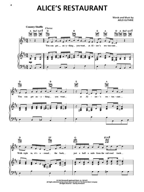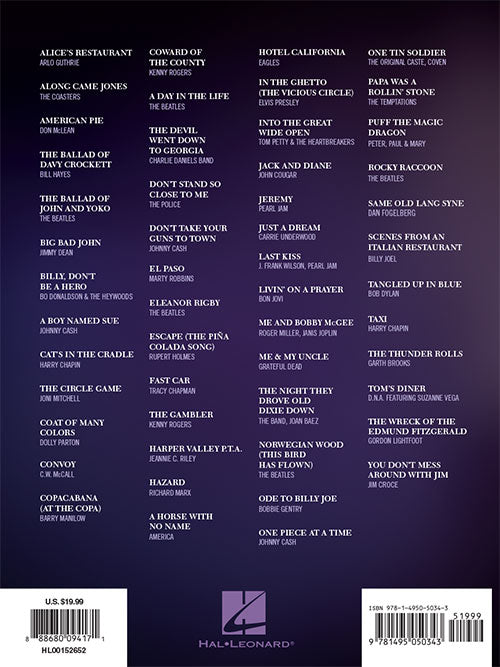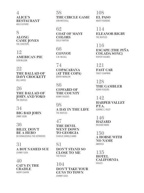 52 of the best-loved stories that used music to come to life, including: Alice's Restaurant · American Pie · Billy, Don't Be a Hero · A Boy Named Sue · Cat's in the Cradle · Copacabana (At the Copa) · Coward of the County · The Devil Went down to Georgia · Eleanor Rigby · Escape (The Pina Colada Song) · Harper Valley P.T.A. · A Horse with No Name · Hotel California · Ode to Billy Joe · Puff the Magic Dragon · Same Old Lang Syne · Taxi · The Wreck of the Edmund Fitzgerald · and more!