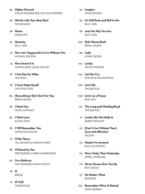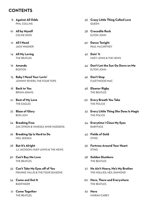 Contents: Against All Odds (Take A Look At Me Now) · All By Myself · All I Need · All My Loving · Amanda · Baby I Need Your Lovin' · Back To You · Best Of My Love · Blaze Of Glory · Breaking Free · Breaking Up Is Hard To Do · But It's Alright · Can't Buy Me Love · Can't Take My Eyes Off Of You · Come And Get It · Come Together · Crazy Little Thing Called Love · Crocodile Rock · Dance Tonight · Doin' It (All For My Baby) · Don't Let The Sun Go Down On Me · Don't Stop · Eleanor Rigby · Every Breath You Take · Every Little Thing She Does Is Magic · (Everything I Do) I Do It For You · Everytime I Close My Eyes · Fields Of Gold · Fortress Around Your Heart · Golden Slumbers · He Ain't Heavy, He's My Brother · Here, There And Everywhere · Hero · Higher Ground · Hit Me With Your Best Shot · Home · Honesty · How Am I Supposed To Live Without You · How Sweet It Is (To Be Loved By You) · I Can See For Miles · I Can't Help Myself (Sugar Pie, Honey Bunch) · I Need You · I Want Love · I Will Remember You (Theme from THE BROTHERS McMULLEN) · I'll Be There · I'll Stand By You · I'm A Believer · If · If I Fell · Imagine · It's Still Rock And Roll To Me · Just The Way You Are · Kids Wanna Rock · Lady · Lately · Let Her Cry · Let It Be · Livin' On A Prayer · The Long And Winding Road · Looks Like We Made It · (Can't Live Without Your) Love And Affection · Maybe I'm Amazed · More Today Than Yesterday · Never Gonna Give You Up · No Matter What · Remember When It Rained · Rocket Man (I Think It's Gonna Be A Long Long Time) · She's Always A Woman · She's Got A Way · Signed, Sealed, Delivered I'm Yours · Solitaire · Somebody To Love · Something To Talk About (Let's Give Them Something To Talk About) · Sometimes When We Touch · A Song For You · Sorry Seems To Be The Hardest Word · Start Of Something New · Still The Same · Takin' It To The Streets · This Ain't A Love Song · Tiny Dancer · Tragedy · True Colors · Unchain My Heart · We've Got Tonight · We've Only Just Begun · Will You Still Love Me · Without You · Wouldn't It Be Nice · Yesterday · You Are So Beautiful · You Are The Sunshine Of My Life · You Can't Hurry Love · You Give Love A Bad Name · You Raise Me Up · You'll Be In My Heart (Pop Version) · You're The Inspiration · You've Lost That Lovin' Feelin' · You've Made Me So Very Happy · Your Song