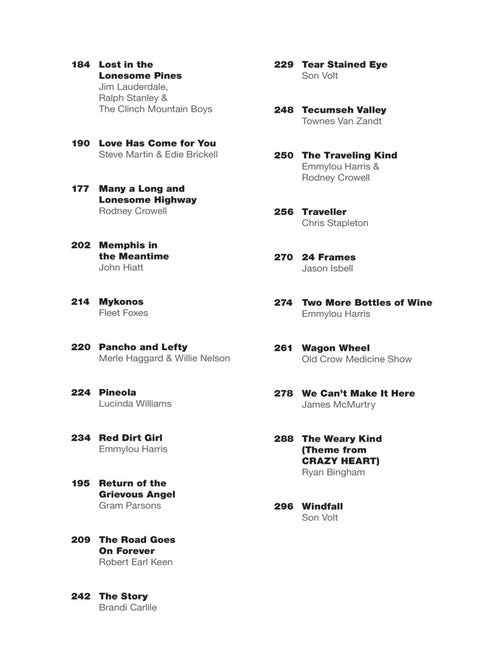 45 roots favorites in arrangements for piano, voice and guitar. Includes: Broken Halos (Chris Stapleton) · Copperhead Road (Steve Earle) · Hurricane (The Band of Heathens) · If I Had a Boat (Lyle Lovett) · If We Were Vampires (Jason Isbell and the 400 Unit) · Live and Die (The Avett Brothers) · Mykonos (Fleet Foxes) · Pancho & Lefty (Merle Haggard & Willie Nelson) · The Story (Brandi Carlile) · Wagon Wheel (Old Crow Medicine Show) · and many more.