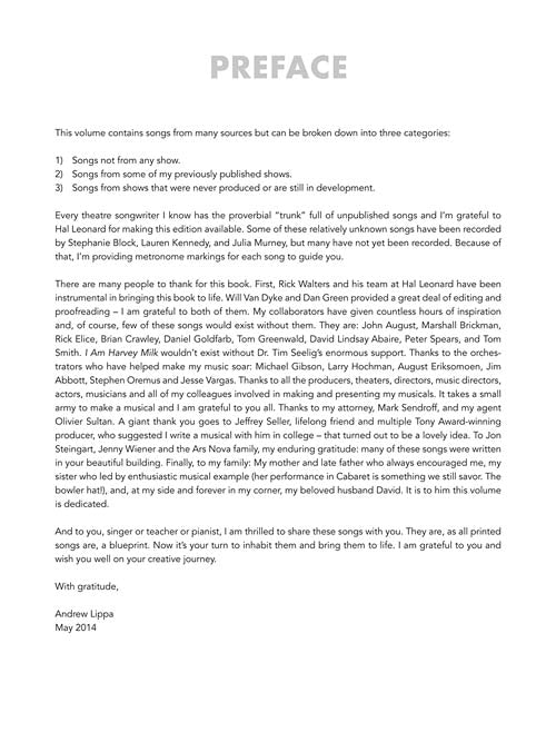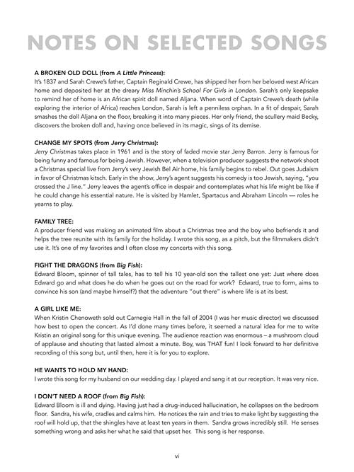 29 songs from the popular Broadway composer and long-time music director for Kristin Chenoweth. Selections include previously unpublished songs and songs from hit shows, including The Wild Party, You're a Good Man, Charlie Brown, john and jen, and more. Also includes a composer biography and notes on the songs. Contents: A Broken Old Doll (from A LITTLE PRINCESS) · Change My Spots (from JERRY CHRISTMAS) · Every Goodbye Is Hello (from JOHN & JEN) · Family Tree (Version in A) · Family Tree (Version in C) · Fight The Dragons (from BIG FISH) · A Girl Like Me · He Wants To Hold My Hand · I Don't Need A Roof (from BIG FISH) · I'm Not Waiting · If The Tables Were Turned (from A LITTLE PRINCESS) · It Should Be Funny (from JERRY CHRISTMAS) · Live Out Loud (from A LITTLE PRINCESS) · Love Somebody Now · Marshall Levin · More Is More Is More (from ASPHALT BEACH) · My New Philosophy (from YOU'RE A GOOD MAN, CHARLIE BROWN) · Not Today (Tour Version) (from THE ADDAMS FAMILY) · One Day · Pulled (from THE ADDAMS FAMILY) · Reiterate (from LIFE WITH FATHER) · She Is (from LIFE WITH FATHER) · Spread A Little Joy (from BETTY BOOP (aborted musical)) · A Story Of My Own (from BIG FISH) · Things My Father Taught Me (from ASPHALT BEACH) · What Is It About Her? (from THE WILD PARTY) · When I First Met Him (Cut from THE WILD PARTY) · You Are Here (from I AM HARVEY MILK) · Your True Love