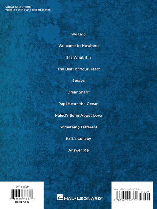 Winner of the 2018 Tony Awards for Best Musical, Best Original Score, and eight others, The Band's Visit is a musical adaptation of the 2007 Israeli film of the same name and features music and lyrics by David Yazbek. This folio features 11 songs with vocal lines and piano accompaniment. Songs include: Answer Me · The Beat of Your Heart · Haled's Song About Love · It Is What It Is · Itzik's Lullaby · Omar Sharif · Papi Hears the Ocean · Something Different · Soraya · Waiting · Welcome to Nowhere.