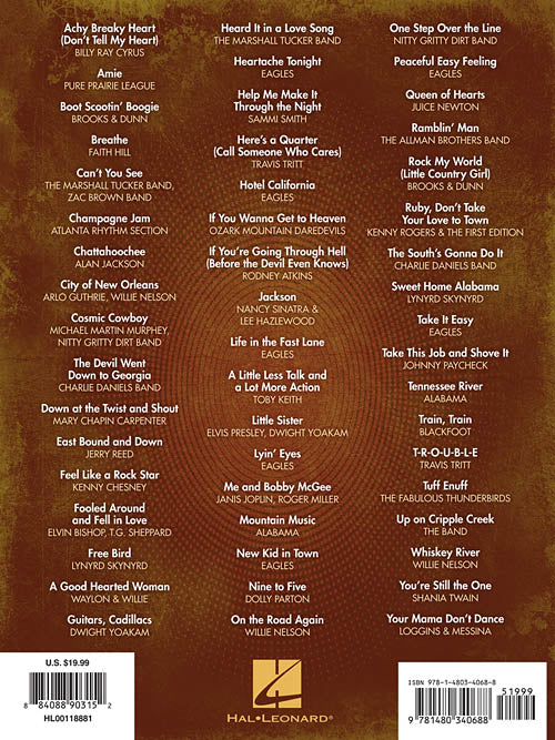 Over 50 songs that walk the line between the country and rock worlds, including: A Little Less Talk and a Lot More Action · Amie · Chattahoochee · City of New Orleans · Fooled Around and Fell in Love · Free Bird · Guitars, Cadillacs · Heartache Tonight · Hotel California · Jackson · Me and Bobby McGee · Mountain Music · Nine to Five · On the Road Again · Ramblin' Man · Sweet Home Alabama · Up on Cripple Creek · Whiskey River · Your Mama Don't Dance · and more.