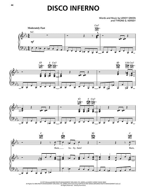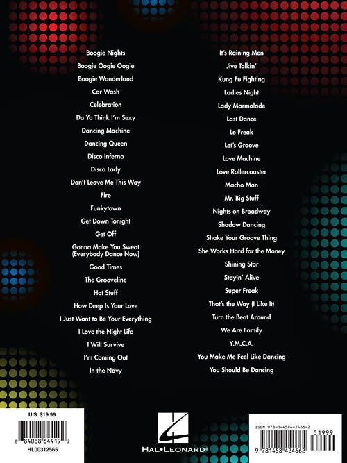 50 favorites from the dance floor arranged for piano/vocal/guitar, including: Boogie Nights · Boogie Wonderland · Car Wash · Celebration · Da Ya Think I'm Sexy · Dancing Queen · Fire · Funkytown · Get down Tonight · Hot Stuff · How Deep Is Your Love · I Love the Night Life · I Will Survive · In the Navy · It's Raining Men · Kung Fu Fighting · Le Freak · Love Rollercoaster · Shadow Dancing · Shake Your Groove Thing · She Works Hard for the Money · Stayin' Alive · Super Freak · That's the Way (I like It) · Turn the Beat Around · We Are Family · Y.M.C.A. · You Make Me Feel like Dancing · You Should Be Dancing · and more.