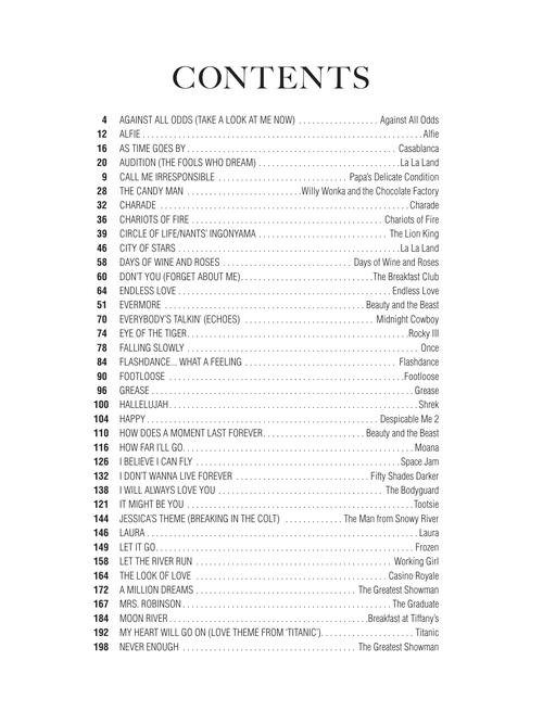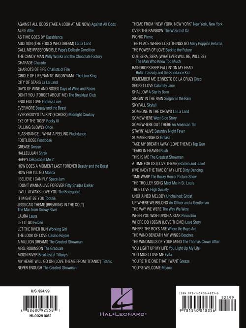 The Best Movie Songs Ever Songbook - 5th Edition Publisher: Hal Leonard Category: Keyboard & Piano/Vocal/Guitar Series: Piano/Vocal/Guitar Songbook Format: Softcover This newly updated edition includes 75 songs made famous on the silver screen: As Time Goes By · City of Stars · Endless Love · Footloose · Hallelujah · I Will Always Love You · Let It Go · A Million Dreams · Moon River · Over the Rainbow · Remember Me (Ernesto de la Cruz) · Shallow · Somewhere Out There · Tears in Heaven · Time Warp · Unchained Melody · The Wind Beneath My Wings · You're the One That I Want · and more. Listen to a Spotify playlist of all the songs from this book! (https://open.spotify.com/playlist/6YWstB5afjDnqNDLr8jhEN) Inventory # : 00291062 UPC: 888680925581 ISBN: 1540048357 Width: 9" Length: 12" Height: 0.952" Product Weight: 2.7 lbs. Number of Pages: 386