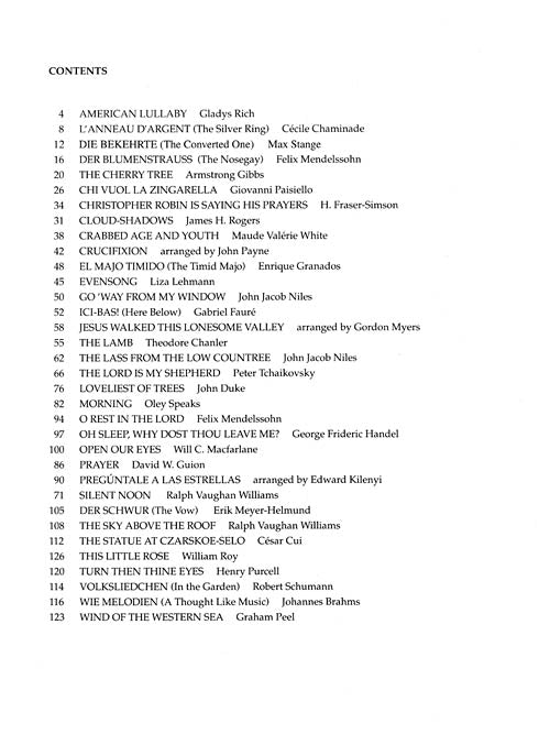 This is among the most widely used teaching repertoire for singers in the U.S. Over 30 songs in each book, including American and British art songs, folk song arrangements, sacred songs and a sampling of beginning songs in German, Italian, Spanish and French. There is a completely different song selection for each voice type. Contents: American Lullaby (Rich) · L'anneau D'argent (Chaminade) · Die Bekehrte (Stange) · Der Blumenstrauss (Mendelssohn) · The Cherry Tree (Gibbs) · Chi Vuol la Zingarella (Paisiello) · Christopher robin is saying his prayers (Rraser-Simson) · Cloud-Shadows (Rogers) · Crabbed Age and Youth (White) · Crucifixion (Payne) · El Majo Timido (Granados) · Evensong (Lehmann) · Go 'Way from my Window (Niles) · Ici-Bas (Faure) · Jesus Walked this Lonesome Valley (Myers) · The Lamb (Chanler) · The Lass from the Low Countree (Niles) · The Lord is my Shepherd (Tchaikovsky) · Loveliest of Trees (Duke) · Morning (Speaks) · O Rest in the Lord (Mendelssohn) · Oh Sleep, Why Dost Thou Leave Me? (Handel) · Open Our Eyes (Macfarlane) · Prayer (Guion) · Preguntale a las Estrellas (Kilenyi) · Silent Noon (Vaughan Williams) · Der Schwur (Meyer-Helmund) · The Sky Above the Roof (Vaughan Williams) · The Statue at Czarskoe-Selo (Cui) · This Little Rose (Roy) · Turn Then Thine Eyes (Purcell) · Volksliedchen (Schumann) · Wie Melodien (Brahms) · Wind of the Western Sea (Peel)