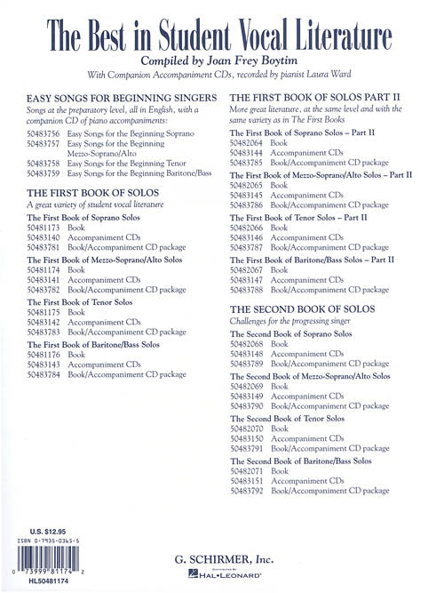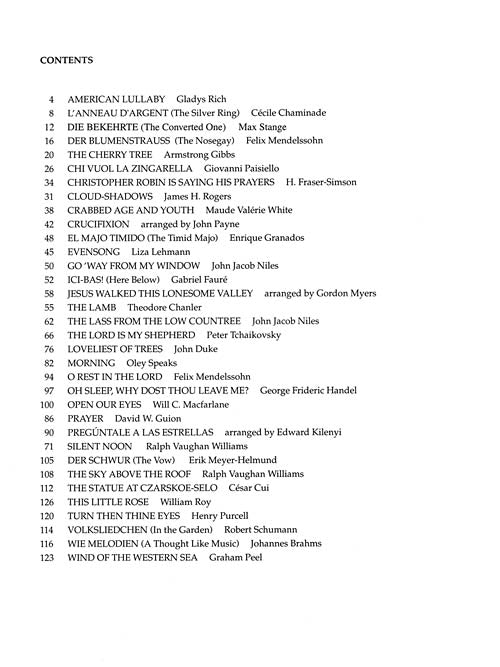 This is among the most widely used teaching repertoire for singers in the U.S. Over 30 songs in each book, including American and British art songs, folk song arrangements, sacred songs and a sampling of beginning songs in German, Italian, Spanish and French. There is a completely different song selection for each voice type. CONTENTS: American Lullaby (G. RICH) · L'Anneau D'Argent (C. CHAMINADE) · Die Bekehrte (M. STANGE) · Der Blumenstrauss (F. MENDELSSOHN) · The Cherry Tree (A. GIBBS) · Chi Vuol La Zingarella (G. PAISIELLO) · Christopher Robin is Saying his Prayers (H. FRASER-SIMSON) · Cloud-Shadows (J.H. ROGERS) · Crabbed Age and Youth (M.V. WHITE) · Crucifixion (J. PAYNE) · El Majo Timido (E. GRANADOS) · Evensong (L. LEHMANN) · Go 'Way from my Window (J.J. NILES) · Ici-Bas! (G. FAURE) · Jesus Walked this Lonesome Valley (G. MYERS) · The Lamb (T. CHANLER) · The Lass from the Low Countree (J.J. NILES) · The Lord is my Shepherd (P.I. TCHAIKOVSKY) · Loveliest of Trees (J. DUKE) · Morning (O. SPEAKS) · O Rest in the Lord (F. MENDELSSOHN) · Oh Sleep, Why dost thou Leave me? (G.F. HANDEL) · Open Our Eyes (W.C. MACFARLANE) · Prayer (D.W. GUION) · Preguntale a las Estrallas (E. KILENYI) · Silent Noon (R. VAUGHAN WILLIAMS) · Der Schwur (E. MEYER-HELMUND) · The Sky Above the Roof (R. VAUGHAN WILLIAMS) · The Statue at Czarskoe-Selo (C. CUI) · This Little Rose (W. ROY) · Turn Then Thine Eyes (H. PURCELL) · Volksliedchen (R. SCHUMANN) · Wie Melodien (J. BRAHMS) · Wind of the Western Sea (G. PEEL)