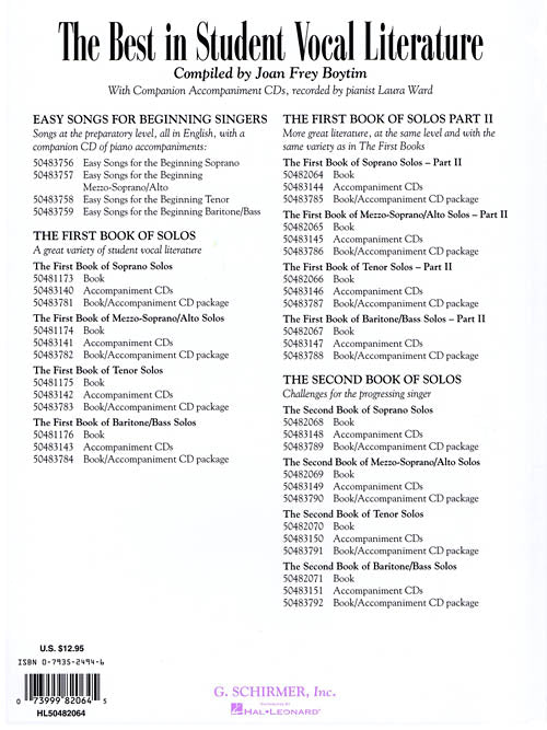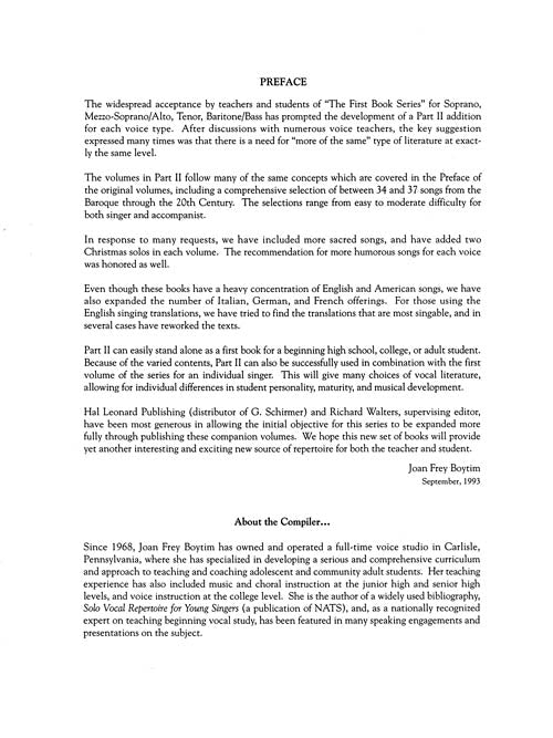 More great teaching material at the same level as the first volume. Over 30 songs in each volume with no song duplicated between voice types. A student could easily begin either in The First Book or The First Book Part II, or the books may be used concurrently. Contents: Animal Crackers (Hageman) · Andenken (Beethoven) · Ave Maria (Abt) · Charmant Papillon (Campra) · Come and Trip It (Handel) · Come to the Fair (Campbell-Tipton) · Drift Down, Drift Down (Ronald) · Gesu Bambino (Yon) · Grandma (Chanler) · Here amid the Shady Woods (Handel) · L'heure Exquise (Hahn) · How Lovely are thy Dwellings (Liddle) · Ich Liebe Dich (Beethoven) · Intorno All'Idol Mio (Cesti) · Lachen Und Weinen (Schubert) · No Flower that Blows (Linley) · The Last Rose of Summer (Miliken) · A Nun Takes the Veil (Barber) · Nur Wer Die Sehnsucht Kennt (Tchaikovsky) · O Saviour, Hear Me! (Gluck) · Orpheus with his Lute (William Schuman) · La Pastorella (Schubert) · Per Non Penar (d'Astorga) · Petit Noel (Louis) · The Prayer Perfect (Speaks) · Quella Barbara Catena (Ciampi) · Romance (Debussy) · Seligkeit (Schubert) · Solvejg's Song (Grieg) · A Spirit Flower (Campbell-Tipton) · To a Wild Rose (MacDowell) · When Daisies Pied (Arne) · When I Was Seventeen (Swedish Folksong)