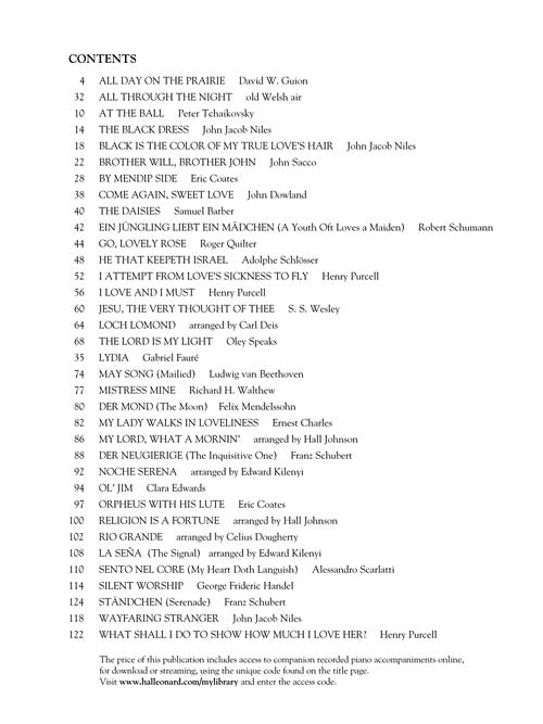 This is among the most widely used teaching repertoire for singers in the U.S. Over 30 songs in each book, including American and British art songs, folk song arrangements, sacred songs and a sampling of beginning songs in German, Italian, Spanish and French. There is a completely different song selection for each voice type. This edition also includes a unique code for access to online audio of professionally recorded piano accompaniments to assist with practice and performance. Audio can be downloaded or streamed according to personal preference. Contents: All Day on the Prairie (Guion) · All Through the Night (Welsh air) · At the Ball (Tchaikovsky) · The Black Dress (Niles) · Black is the Color of my True Loves Hair (Niles) · Brother Will, Brother John (Sacco) · My Mendip Side (Coates) · Come again, Sweet Love (Dowland) · The Daisies (Barber) · Ein Jungling Liebt ein Madchen (Schumann) · Go, Lovely Rose (Quilter) · He That Keepeth Israel (Schlosser) · I Attempt from Love's Sickness to Fly (Purcell) · I Love and I Must (Purcell) · Jesu, the very Thought of Thee (Wesley) · Loch Lomond (Dies) · The Lord is my Light (Speaks) · Lydia (Faure) · May Song (Beethoven) · Mistress Mine (Walthew) · Der Mond (Mendelssohn) · My Lady Walks in Loveliness (Charles) · My Lord, What a Mornin' (Johnson) · der Neugierige (Schubert) · Noche Serena (Kilenyi) · Ol' Jim (Edwards) · Orpheus with his Lute (Coates) · Religion is a Fortune (Johnson) · rio Grande (Dougherty) · La Sena (Kilenyi) · Sento Nel Core (Scarlatti) · Silent Worship (Handel) · Standchen (Schubert) · Wayfaring Stranger (Niles) · what Shall I Do to Show How Much I Love Her? (Purcell)