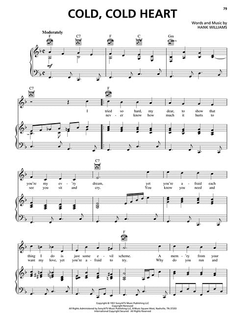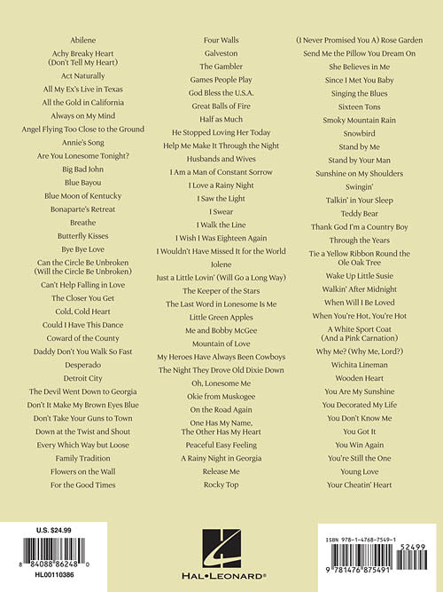 This essential compendium of country tunes includes: Abilene · Always on My Mind · Are You Lonesome Tonight? · Blue Bayou · Breathe · Butterfly Kisses · Can the Circle Be Unbroken · Cold, Cold Heart · Desperado · The Devil Went Down to Georgia · Flowers on the Wall · For the Good Times · Galveston · The Gambler · God Bless the U.S.A. · I Swear · Jolene · The Keeper of the Stars · On the Road Again · Rocky Top · Smoky Mountain Rain · Stand by Your Man · When Will I Be Loved · You Don't Know Me · Your Cheatin' Heart · and scores more! 400 pages of music!