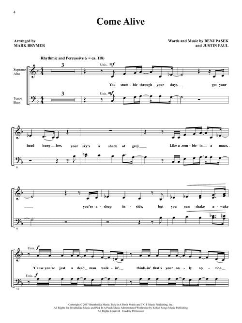 This great new collection lets vocalists sing songs from The Greatest Showman with a professional quality choir. The book includes SATB parts and the online audio features full performances for download or streaming. Listen to the audio, open the book, pick your part, and sing along! Songs include: Come Alive · The Greatest Show · A Million Dreams · Never Enough · Rewrite the Stars · This Is Me. Audio is accessed online using the unique code inside the book and can be streamed or downloaded. The audio files include PLAYBACK+, a multi-functional audio player that allows you to slow down audio without changing pitch, set loop points, change keys, and pan left or right.