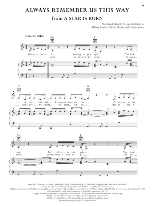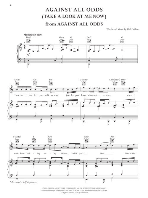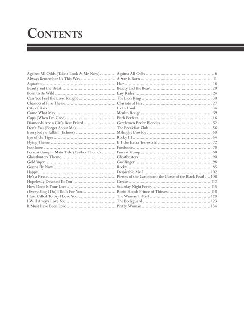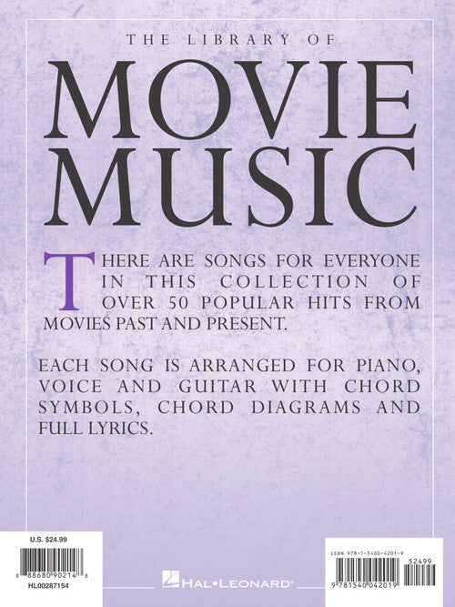 Over 50 top songs from the silver screen are included in this collection for piano, voice and guitar. Songs: Against All Odds (Take a Look at Me Now) · Beauty and the Beast · Chariots of Fire · City of Stars · Don't You (Forget About Me) · Eye of the Tiger · Footloose · Ghostbusters · Hopelessly Devoted to You · I Will Always Love You · Mrs. Robinson · My Heart Will Go On (Love Theme from 'Titanic') · Theme from New York, New York · Over the Rainbow · Singin' in the Rain · Skyfall · Stayin' Alive · This Is Me · Unchained Melody · The Way We Were · and more.