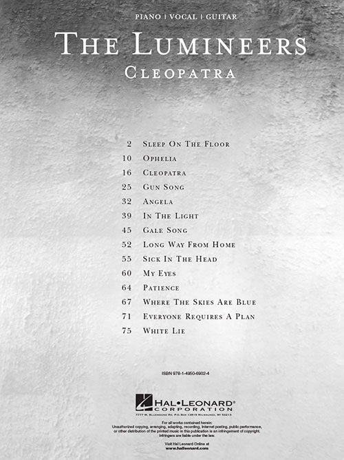 This long-awaited sophomore album release by the Lumineers topped the Billboard® album charts. Our songbook features 14 songs blending country, folk and pop styles in arrangements for piano, voice and guitar. Includes: Angela · Cleopatra · Gale Song · In the Light · Long Way from Home · My Eyes · Ophelia · Patience · Sleep on the Floor · and more.