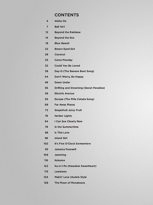 A thorough collection of over 60 tunes perfect for island life, including: Bali Ha'i · Beyond the Sea · Blue Hawaii · Coconut · Could You Be Loved · Don't Worry, Be Happy · Electric Avenue · Escape (The Pina Colada Song) · I Can See Clearly Now · Island Girl · Kokomo · No Shoes No Shirt (No Problems) · Over the Rainbow · Red, Red Wine · Redemption Song · Rivers of Babylon · Surfer Girl · The Tide Is High · Tiny Bubbles · and many more.
