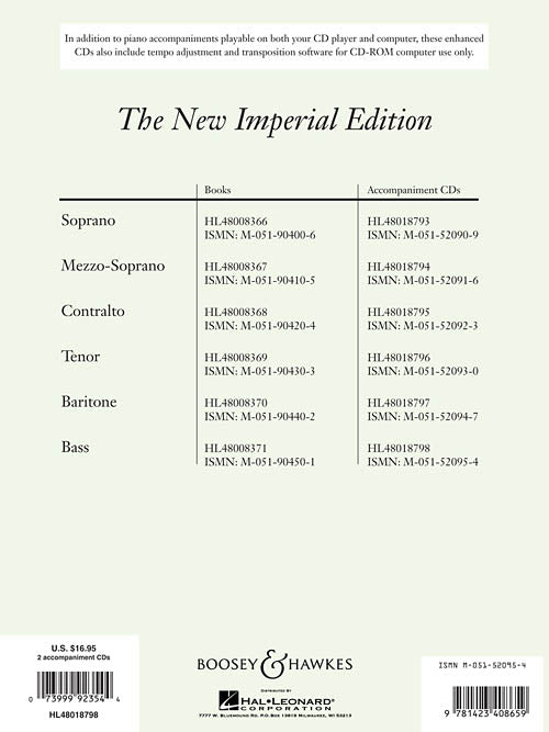 These collections of 30 songs each, released over 50 years ago, have been a mainstay of classical vocal study. There is a different song list for each voice type. Now accompaniment CDs are available that match each book. Special CD-ROM features are added to the audio CD which allow the tempo on the accompaniments to be adjusted without changing the pitch, or also, allow transposition.