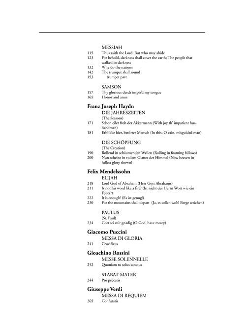 Contents: C.P.E. Bach: Fecit potentiam (Magnificat) - J.S. Bach: Quia fecit (Magnificat) · Et in spiritum sanctum (Mass in b minor) · Gerne will ich, Komm susses Kreuz, Mache dich mein Herze rein (St. Matthew Passion) · Betrachte, meine Seele (St. John Passion) · Grosser Herr (Christmas Oratorio) - Berlioz: O misère des rois! (L'enfance du Christ) - Fauré: Hostias (Requiem) - Handel: Revenge, Timotheus cries (Alexander's Feast) · Behold the monstrous human beast (Belshazzar) · See, the raging flames arise (Joshua) · Arm, arm, ye brave (Judas Maccabaeus) · But who may abide the day of his coming?, The people that walked in darkness, Why do the nations so furiously rage together?, The trumpet shall sound (Messiah) · Thy glorious deeds, Honor and arms (Samson) - Haydn: Rolling in foaming billows, Now heaven in fullest glory shown (The Creation) · Schon eilet froh der Ackersman, Erblicke hier, betörter Mensch (Die Jahrezeiten) - Mendelssohn: For the mountains shall depart, Is not his word like a fire?, Lord God of Abraham, It is enough (Elijah) · O God have mercy (St. Paul) - Puccini: Crucifixus (Messa di Gloria) - Rossini: Pro peccatis (Stabat Mater) · Quoniam (Messe Solennelle) - Verdi: Confutatis (Requiem).
