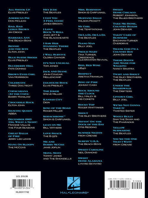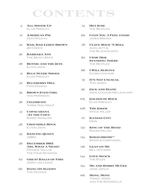 Nearly 60 standards guaranteed to get the piano bar jumpin'! Includes: All Shook Up · American Pie · Bad, Bad Leroy Brown · Bennie and the Jets · Brown Eyed Girl · Dancing Queen · Great Balls of Fire · Hey Jude · I Will Survive · Jack and Diane · King of the Road · Lean On Me · Love Shack · Mony, Mony · Mustang Sally · Piano Man · Proud Mary · Red, Red Wine · Respect · Ring of Fire · Shout · Sweet Caroline · Yellow Submarine · and more.