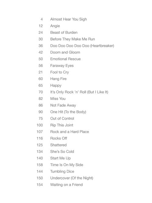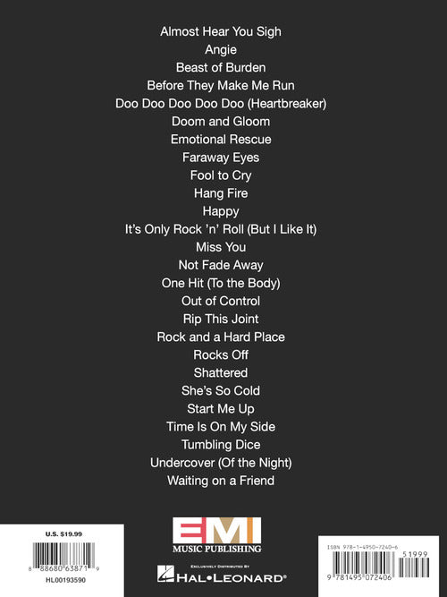 This fantastic collection features over 25 hits from the legendary rockers in piano/vocal/guitar notation, including: Angie · Beast of Burden · Emotional Rescue · Fool to Cry · Happy · It's Only Rock 'N' Roll (But I like It) · Miss You · Not Fade Away · Rocks Off · Shattered · Start Me Up · Time Is on My Side · Tumbling Dice · Waiting on a Friend · and more.