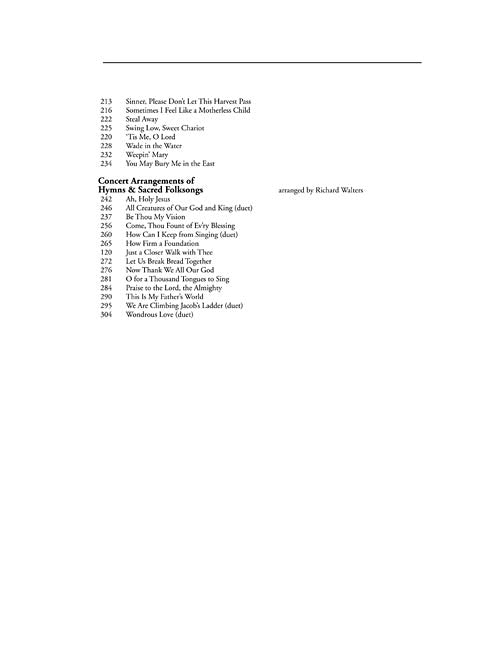 A huge collection of 70 sacred songs for classical singers, spanning an enormous range of literature, including art songs, traditional songs, 28 classic Burleigh spiritual arrangements (experts on African-American spirituals contend they are for singers of all ethnic heritages), and distinctive concert arrangements of hymns and folksongs by Richard Walters. There are four duets included. This collection will be as useful in the voice studio as in every working singer's repertoire and every church music library.