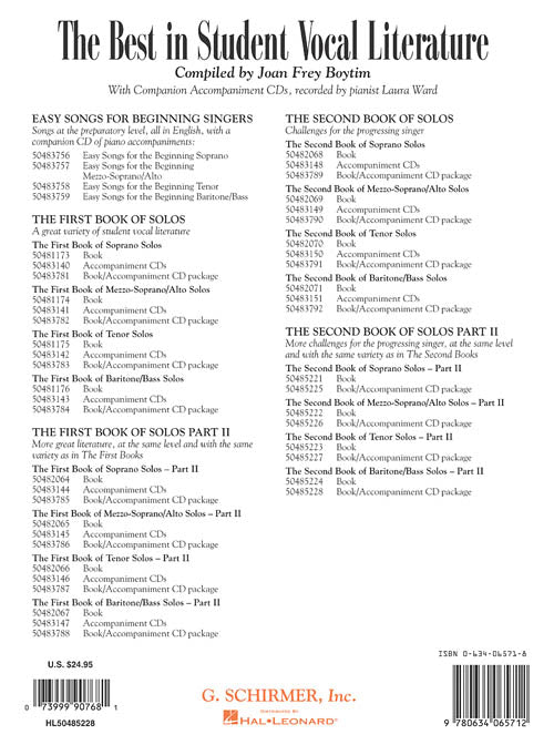 More great classical material for progressing vocal students, from the leading American expert in teaching the young voice. The series started with The First Book of Solos, and then, at the same difficulty level, came The First Book of Solos - Part II. The Second Book of Solos, originally released in 1993, is for singers who have taken voice a little longer and are capable of more challenges, but is still decidedly student-level material, and music that can be sung by good high school students. The new The Second Book of Solos - Part II set is at exactly the same level as The Second Book of Solos. It shares the same features: a deliberate variety of music in different styles and languages, including a few sacred selections, with over 30 songs per book. Available as books only, or in packs with two CDs of piano accompaniments recorded by Laura Ward. CONTENTS: All'Acquisto Di Gloria (A. SCARLATTI) · An Chloe (W.A. MOZART) · Art Thou the Christ? (G. O'HARA) · Auf dem Kirchhofe (J. BRAHMS) · Ave Maria (L. LUZZI) · Die Beiden Grenadiere (R. SCHUMANN) · The Bird and the Beast (C. DOUGHERTY) · La Chanson du Pecheur (G. FAURE) · Le Cor (A. FLEGIER) · Heavenly Grass (P. BOWLES) · Honor and Arms (G.F. HANDEL) · If You Give Me Your Attention (A. SULLIVAN) · Madrigal (M. SANDOVAL) · My Boy, You May Take it from Me (A. SULLIVAN) · My Soul is Athirst for God (W. STICKLES) · Nel Riposo e Nel Contento (G.F. HANDEL) · Nocturne (G. FAURE) · Non e Ver! (T. MATTEI) · Obstination (H. DE FONTENAILLES) · Revenge, Timotheus Cries (G.F. HANDEL) · Silver (J. DUKE) · Sleep (I. GURNEY) · Son Tutta Duolo (A. SCARLATTI) · Take, o Take Those Lips Away (R. QUILTER) · Three for Jack (W.H. Squire) · The Topsails Shiver in the Wind (T. ARNE) · Traum Durch Die Dammerung (R. STRAUSS) · Zueignung (R. STRAUSS)