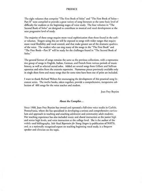 Step up to the next level with more student repertoire, continuing from The First Book of Solos and The First Book of Solos - Part II. The more than 30 songs in each book require a little more vocal range and musical sophistication, but are still decidedly student material.