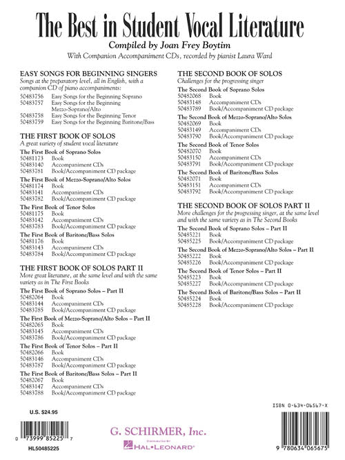 More great classical material for progressing vocal students, from the leading American expert in teaching the young voice. The series started with The First Book of Solos, and then, at the same difficulty level, came The First Book of Solos - Part II. The Second Book of Solos, originally released in 1993, is for singers who have taken voice a little longer and are capable of more challenges, but is still decidedly student-level material, and music that can be sung by good high school students. The new The Second Book of Solos - Part II set is at exactly the same level as The Second Book of Solos. It shares the same features: a deliberate variety of music in different styles and languages, including a few sacred selections, with over 30 songs per book. Available as books only, or in packs with audio access codes printed inside the covers to use online for download or streaming. Piano accompaniments recorded by Laura Ward. CONTENTS: Alleluja (W.A. MOZART) · Als Luise Die Briefe Ihres Ungetreuen (W.A. MOZART) · Apres un Reve (G. FAURE) · La Belle au Bois dormant (F. FOURDRAIN) · The Bird (J. DUKE) · Care Selve (G.F. HANDEL) · Chanson Norvegienne (F. FOURDRAIN) · Clavelitos (J. VALVERDE) · Crabbed Age and Youth (C.H.H. Parry) · Domine Deus (A. VIVALDI) · The Fields are Full (C.A. GIBBS) · I Mourn as a Dove (J. BENEDICT) · Il Mio Ben Quando Verra (G. PAESIELLO) · J'Ai Pleure En Reve (G. HUE) · The Lord's Name is Praised (M. GREENE) · Love is a Plaintive Song (A. SULLIVAN) · Mandoline (G. FAURE) · Mausfallen-Spruchlein (H. WOLF) · Mondnacht (R. SCHUMANN) · My Sweetheart and I (A. BEACH) · Niemand Hat's Geseh'n (J.K.G. LOEWE) · Non Ti Fidar (G.F. HANDEL) · Quel Ruscelletto (P.D. PARADIES) · Le Rossignol Des Lilas (R. HAHN) · Sorry Her Lot Who Loves Too Well (A. SULLIVAN) · Spring (I. GURNEY) · Standchen (J. BRAHMS) · Sure on this Shining Night (S. BARBER) · That's Life (J.P. SACCO) · Think on These Things (J.C. KIRLIN) · To One Who Passed Whistling Through the Night (C.A. GIBBS) · The White Peace (A. BAX) · Wind (T. CHANLER)