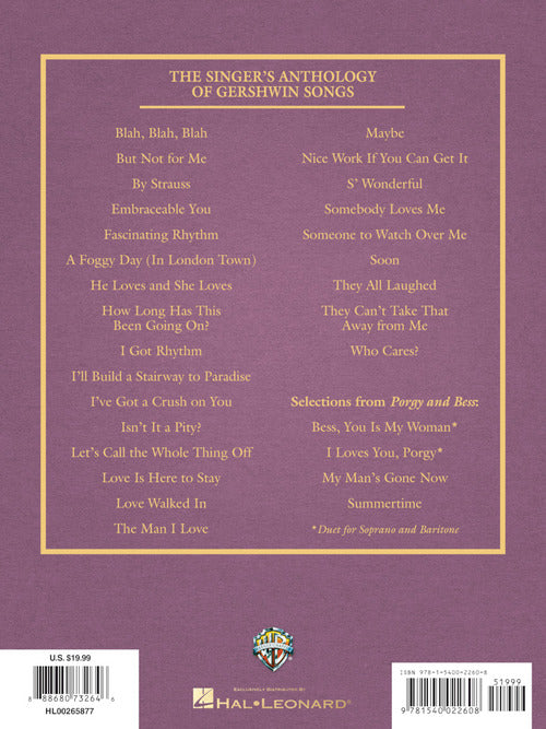A collection of Gershwin songs, curated for today's singer, transposed into appropriate keys, based on original sources. SOPRANO CONTENTS: Bess, You Is My Woman · Blah, Blah, Blah · But Not for Me · By Strauss · Embraceable You · Fascinating Rhythm · A Foggy Day (In London Town) · He Loves and She Loves · How Long Has This Been Going On? · I Got Rhythm · I Loves You, Porgy · I'll Build a Stairway to Paradise · I've Got a Crush on You · Isn't It a Pity? · Let's Call the Whole Thing Off · Love Is Here to Stay · Love Walked In · The Man I Love · Maybe · My Man's Gone Now · Nice Work If You Can Get It · 'S Wonderful · Somebody Loves Me · Someone to Watch Over Me · Soon · Summertime · They All Laughed · They Can't Take That Away from Me · Who Cares? (So Long As You Care for Me).