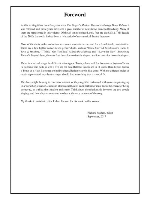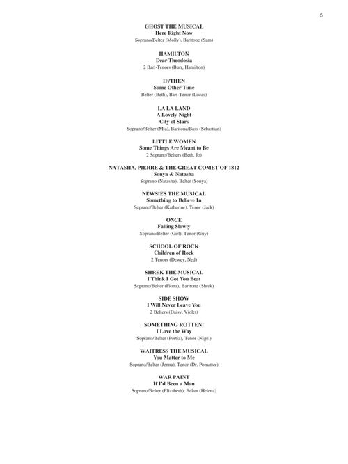 A collection of songs from the musical stage, written for duets of various voice types. The selections are presented in their authentic settings, excerpted from the original vocal scores. Contents: ALADDIN: A Million Miles Away and A Whole New World · AMAZING GRACE: Someone Who Hears · ANASTASIA: In a Crowd of Thousands · BIG FISH: Time Stops · THE BOOK OF MORMON: Baptize Me · THE BRIDGES OF MADISON COUNTY: Falling Into You and Before and After You/One Second and a Million Miles · BRIGHT STAR: I Had a Vision · DEAR EVAN HANSEN: Only Us · FINDING NEVERLAND: What You Mean to Me · FIRST DATE: Something That Will Last · FROZEN: Love Is an Open Door · A GENTLEMAN'S GUIDE TO LOVE & MURDER: Better with a Man and Inside Out · GHOST THE MUSICAL: Here Right Now · HAMILTON: Dear Theodosia · IF/THEN: Some Other Me · LA LA LAND: City of Stars and A Lovely Night · LITTLE WOMEN: Some Things Are Meant to Be · NATASHA, PIERRE & THE GREAT COMET OF 1812: Sonya & Natasha · NEWSIES THE MUSICAL: Something to Believe In · ONCE: Falling Slowly · SCHOOL OF ROCK: Children of Rock · SHREK THE MUSICAL: I Think I Got You Beat · SIDE SHOW: I Will Never Leave You · SOMETHING ROTTEN: I Love the Way · WAITRESS THE MUSICAL: You Matter to Me.