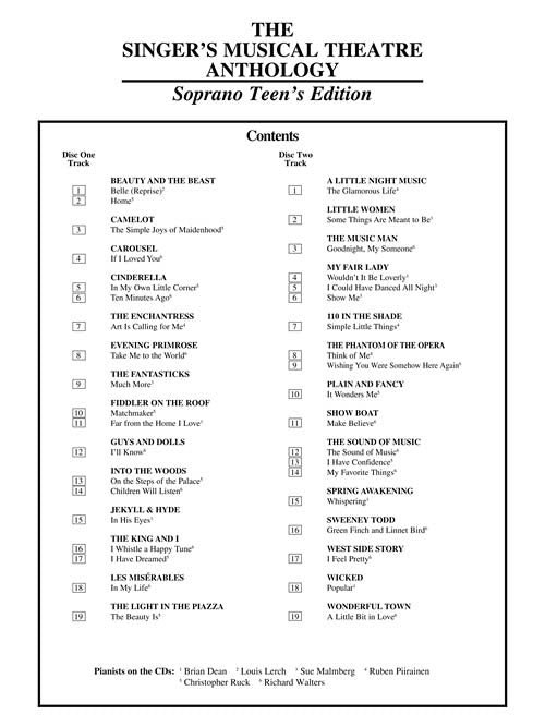 Contents: BEAUTY AND THE BEAST: Belle (Reprise), Home · CAMELOT: The Simple Joys of Maidenhood · CAROUSEL: If I Loved You · CINDERELLA: In My Own Little Corner, Ten Minutes Ago · THE ENCHANTRESS: Art Is Calling for Me · EVENING PRIMROSE: Take Me to the World · THE FANTASTICKS: Much More · FIDDLER ON THE ROOF: Matchmaker, Far from the Home I Love · GUYS AND DOLLS: I'll Know · INTO THE WOODS: On the Steps of the Palace, Children Will Listen · JEKYLL & HYDE: In His Eyes · THE KING AND I: I Whistle a Happy Tune, I Have Dreamed · LES MISÉRABLES: In My Life · THE LIGHT IN THE PIAZZA: The Beauty Is · A LITTLE NIGHT MUSIC: The Glamorous Life · LITTLE WOMEN: Some Things Are Meant to Be · THE MUSIC MAN: Goodnight, My Someone · MY FAIR LADY: Wouldn't It Be Loverly, I Could Have Danced All Night, Show Me · 110 IN THE SHADE: Simple Little Things · THE PHANTOM OF THE OPERA: Think of Me, Wishing You Were Somehow Here Again · PLAIN AND FANCY: It Wonders Me · SHOW BOAT: Make Believe · THE SOUND OF MUSIC: The Sound of Music, I Have Confidence, My Favorite Things · SPRING AWAKENING: Whispering · SWEENEY TODD: Green Finch and Linnet Bird · WEST SIDE STORY: I Feel Pretty · WICKED: Popular · WONDERFUL TOWN: A Little Bit in Love