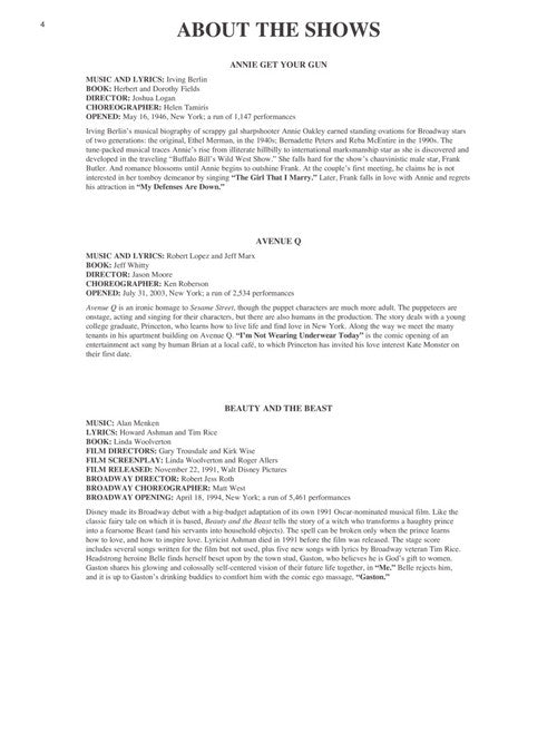 Contents: ANNIE GET YOUR GUN: The Girl That I Marry, My Defenses Are Down · AVENUE Q: I'm Not Wearing Underwear Today · BEAUTY AND THE BEAST: Me, Gaston · BIG RIVER: Waitin' for the Light to Shine · BYE BYE BIRDIE: Put on a Happy Face · CAMELOT: Camelot, C'est Moi, If Ever I Would Leave You · CINDERELLA: Ten Minutes Ago, Do I Love You Because You're Beautiful? · THE FANTASTICKS: Try to Remember · A FUNNY THING HAPPENED ON THE WAY TO THE FORUM: Comedy Tonight · GREASE: Greased Lightnin' · GUYS AND DOLLS: My Time of Day, Luck Be a Lady · HELLO, DOLLY!: It Only Takes a Moment · LES MISÉRABLES: Empty Chairs at Empty Tables, Stars · LITTLE ME: Real Live Girl · THE LITTLE MERMAID : Les Poissons · ME AND MY GIRL: Leaning on a Lamp Post · MERRILY WE ROLL ALONG: Good Thing Going · MINNIE'S BOYS: Where Was I When They Passed Out the Luck? · NEWSIES: Santa Fe · OKLAHOMA!: Oh, What a Beautiful Mornin' · PAINT YOUR WAGON: They Call the Wind Maria · THE PRODUCERS: I Wanna Be a Producer · PUTTIN' ON THE RITZ: Puttin' on the Ritz · THE ROAR OF THE GREASEPAINT-THE SMELL OF THE CROWD: A Wonderful Day Like Today · THE SOUND OF MUSIC: Edelweiss · SPRING AWAKENING: All That's Known · STOP THE WORLD-I WANT TO GET OFF: Gonna Build a Mountain · TOY STORY 2: When She Loved Me · WEST SIDE STORY: Jet Song, Cool