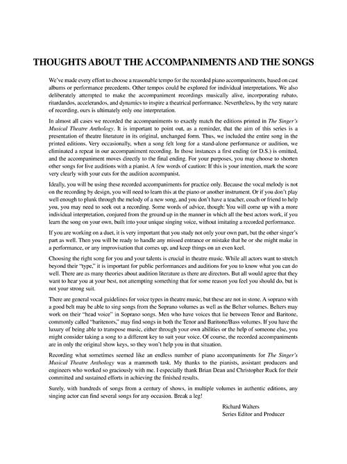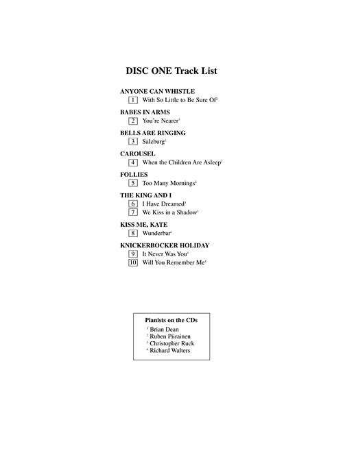 Two accompaniment CDs in each package which match the books containing a collection of songs from the musical stage, categorized by voice type. The selections are presented in their authentic settings, excerpted from the original vocal scores. Contents: ANYONE CAN WHISTLE: With So Little to Be Sure Of · BABES IN ARMS: You're Nearer · BELLS ARE RINGING: Salzburg · CAROUSEL: When the Children Are Asleep · FOLLIES: Too Many Mornings · THE KING AND I: I Have Dreamed, We Kiss in a Shadow · KISS ME, KATE: Wunderbar · KNICKERBOCKER HOLIDAY: It Never Was You, Will You Remember Me · THE MOST HAPPY FELLA: My Heart Is So Full of You · OKLAHOMA!: People Will Say We're in Love · 110 IN THE SHADE: A Man and a Woman · PORGY AND BESS: Bess, You Is My Woman, I Loves You, Porgy, What You Want Wid Bess? · ROBERTA: The Touch of Your Hand · SHOW BOAT: Make Believe, You Are Love · SONG OF NORWAY: Strange Music · STREET SCENE: We'll Go Away Together