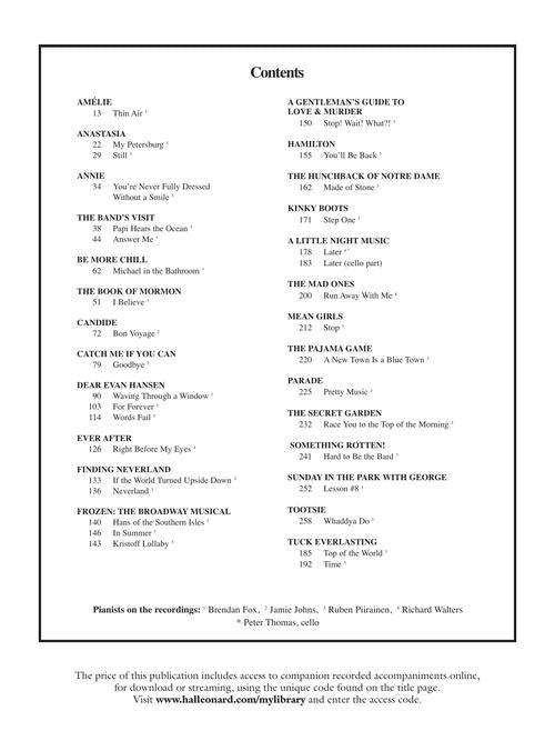 A collection of songs from the musical stage presented in their authentic settings, excerpted from the original vocal scores. There is no duplication from prior volumes! This edition features access to online recorded accompaniments. Audio is accessed online using the unique code inside the book and can be streamed or downloaded. The audio files include PLAYBACK+, a multi-functional audio player that allows you to slow down audio without changing pitch, set loop points, change keys, and pan left or right. Contents: AMÉLIE: Thin Air · ANASTASIA: My Petersburg · Still · ANNIE: You're Never Fully Dressed Without a Smile · THE BAND'S VISIT: Papi Hears the Ocean · Answer Me · BE MORE CHILL: Michael in the Bathroom · THE BOOK OF MORMON: I Believe · CANDIDE: Bon Voyage · CATCH ME IF YOU CAN: Goodbye · DEAR EVAN HANSEN: Waving Through a Window · For Forever · Words Fail · EVER AFTER: Right Before My Eyes · FINDING NEVERLAND: If the World Turned Upside Down · Neverland · FROZEN THE BROADWAY MUSICAL: Hans of the Southern Isles · In Summer · Kristoff Lullaby · A GENTLEMAN'S GUIDE TO LOVE & MURDER: Stop! Wait! What?! · HAMILTON: You'll Be Back · THE HUNCHBACK OF NOTRE DAME: Made of Stone · KINKY BOOTS: Step One · A LITTLE NIGHT MUSIC: Later · THE MAD ONES: Run Away With Me · MEANGIRLS: Stop · THE PAJAMA GAME: A New Town Is a Blue Town · PARADE: Pretty Music · THE SECRET GARDEN: Race You to the Top of the Morning · SOMETHING ROTTEN!: Hard to Be the Bard · SUNDAY IN THE PARK WITH GEORGE: Lesson #8 · TOOTSIE: Waddya Do · TUCK EVERLASTING: Top of the World · Time