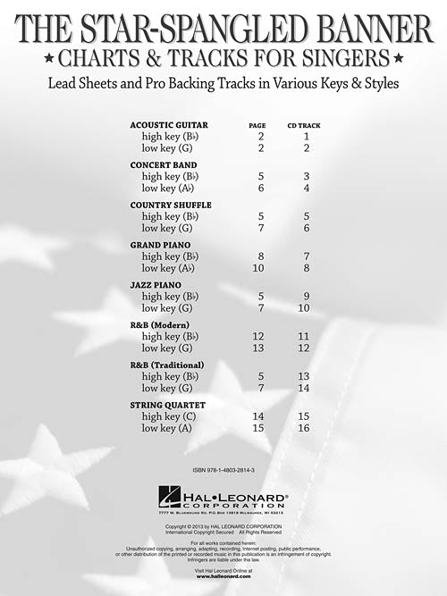 You've always imagined the crowd rising as you sing the National Anthem at your favorite sporting event, assembly or rally. Now you can practice and perform The Star-Spangled Banner in your favorite style and in your key! Here are the lead sheets and professional backing tracks you'll need to put your patriotism on full display. Each style features two tracks and two keys, one high and one low. Sheet music versions for keyboard and acoustic guitar are also included. Styles: acoustic guitar; concert band; country shuffle; grand piano; jazz piano; R&B (modern); R&B (traditional); string quartet.