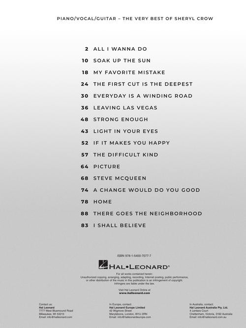This songbook features 16 Sheryl Crow favorites arranged for piano and voice with guitar chord frames. Songs include: All I Wanna Do · A Change Would Do You Good · The Difficult Kind · Everyday Is a Winding Road · The First Cut Is the Deepest · Home · I Shall Believe · If It Makes You Happy · Leaving Las Vegas · Light in Your Eyes · My Favorite Mistake · Picture · Soak up the Sun · Steve McQueen · Strong Enough · There Goes the Neighborhood.