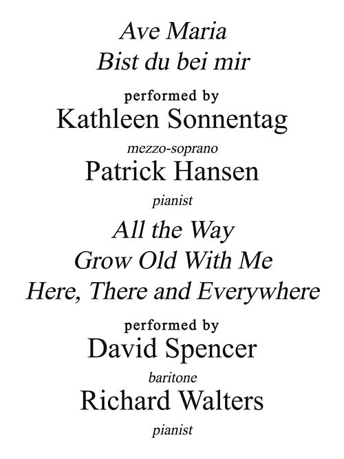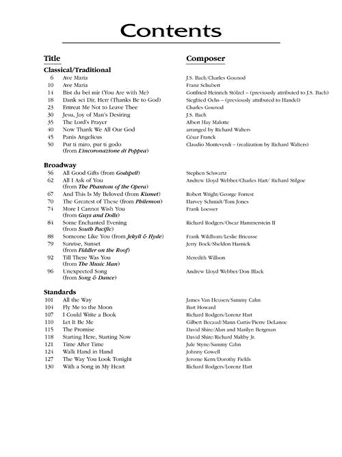 An all-in-one volume wedding resource for singers, with 47 songs in several styles: classical/traditional, Broadway, standards (in new, singer-flattering arrangements), pop/rock classics, and contemporary Christian. With this collection, any singer will be able to find songs to please any bride. Contents, CLASSICAL/TRADITIONAL: Ave Maria (BACH) · Ave Maria (SCHUBERT) · Bist du bei mir (STOLZEL)· Dank sei Dir, Herr (OCHS) · Entreat Me Not to Leave Thee (GOUNOD) · Jesu, Joy of Man's Desiring (BACH) · The Lord's Prayer (MALOTTE) · Now Thank We All Our God · Panis Angelicus (FRANCK) · Pur ti miro, pur ti godo (MONTEVERDI) · BROADWAY: All Good Gifts (GODSPELL) · All I Ask of You (THE PHANTOM OF THE OPERA) · And This Is My Beloved (KISMET) · The Greatest of These (PHILEMON) · More I Cannot Wish You (GUYS AND DOLLS) · Some Enchanted Evening (SOUTH PACIFIC) · Someone Like You (JEKYLL & HYDE) · Sunrise, Sunset (FIDDLER ON THE ROOF) · Till There Was You (THE MUSIC MAN) · Unexpected Song (SONG & DANCE) · STANDARDS: All the Way (VAN HEUSEN) · Fly Me to the Moon (HOWARD) · I Could Write a Book (RODGERS) · Let It Be Me (BECAUD) · The Promise (SHIRE) · Starting Here, Starting Now (SHIRE) · Time After Time (STYNE) · Walk Hand in Hand (COWELL) · The Way You Look Tonight (KERN) · With a Song in My Heart (RODGERS)