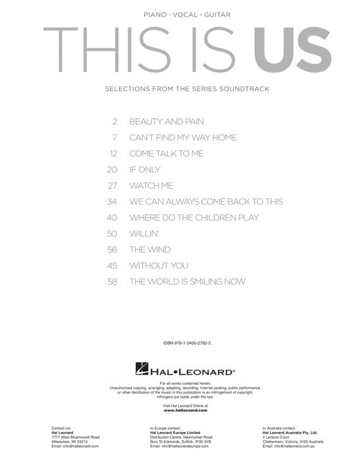 11 memorable musical selections from seasons 1 and 2 of this popular television show. Includes piano/vocal/guitar arrangements of: Beauty and Pain · Can't Find My Way Home · Come Talk to Me · If Only · Watch Me · We Can Always Come Back to This · Where Do the Children Play · Willin' · The Wind · Without You · The World Is Smiling Now.