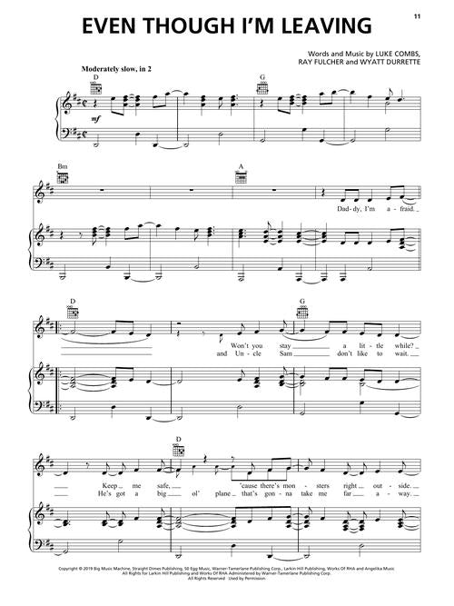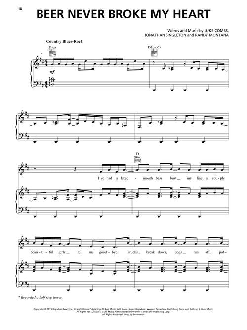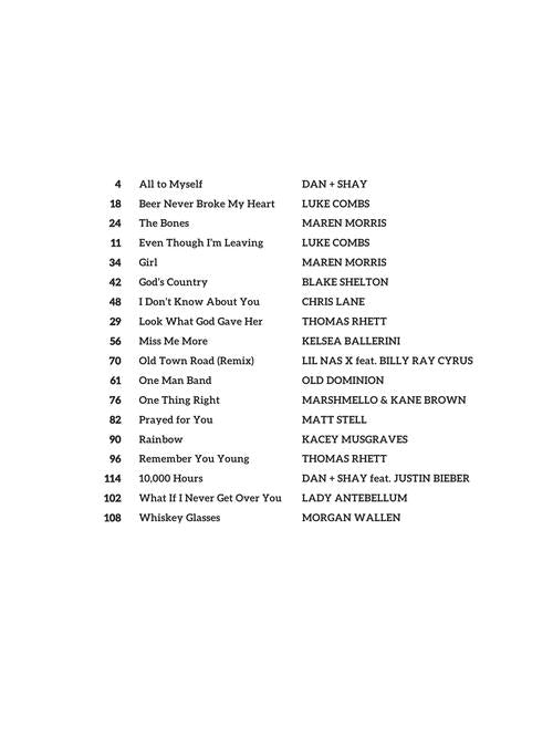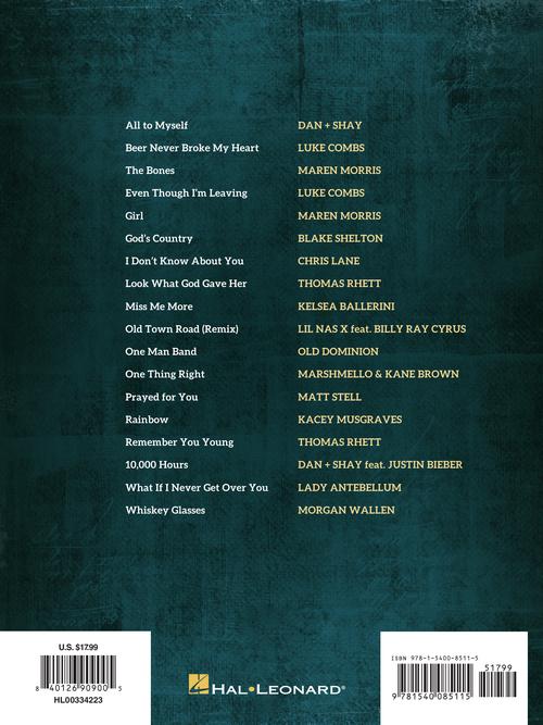 18 of the best country songs from 2019 to 2020 arranged for piano and voice with guitar chord frames: Beer Never Broke My Heart (Luke Combs) · The Bones (Maren Morris) · God's Country (Blake Shelton) · Look What God Gave Her (Thomas Rhett) · Old Town Road (Remix) (Lil Nas X feat. Billy Ray Cyrus) · One Thing Right (Marshmello & Kane Brown) · Rainbow (Kacey Musgraves) · 10,000 Hours (Dan + Shay feat. Justin Bieber) · Whiskey Glasses (Morgan Wallen) · and more.